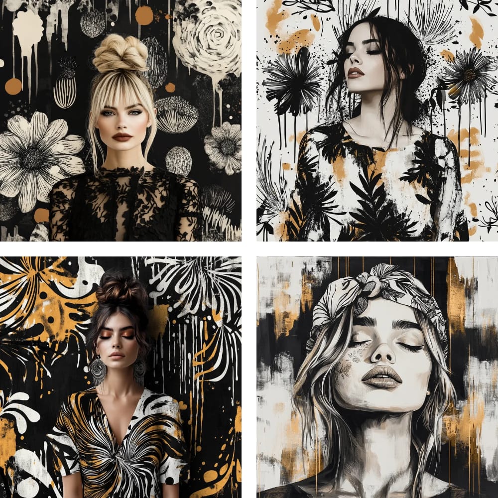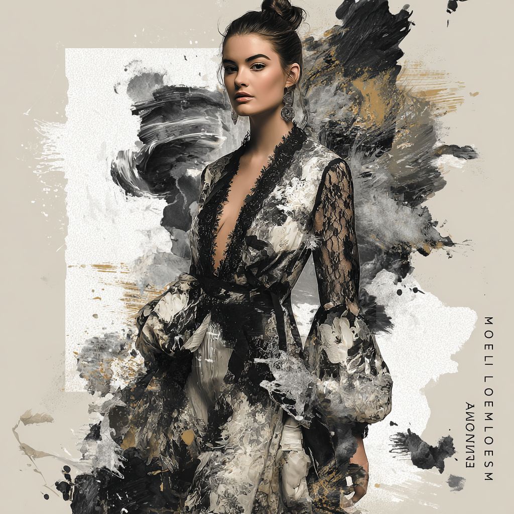 /imagine prompt: A fashion editorial portrait of a model, embodying the "Ephemeral Bloom" aesthetic, in the Monochrome Abstract Bloom art style. The model is striking and elegant, seamlessly integrated with a dynamic background of black, white, and metallic gold abstract floral brushstrokes and ink splatters. Her attire features intricate lace and flowing fabric with matching abstract floral patterns. Strong artistic composition, high fashion photography, expressionistic