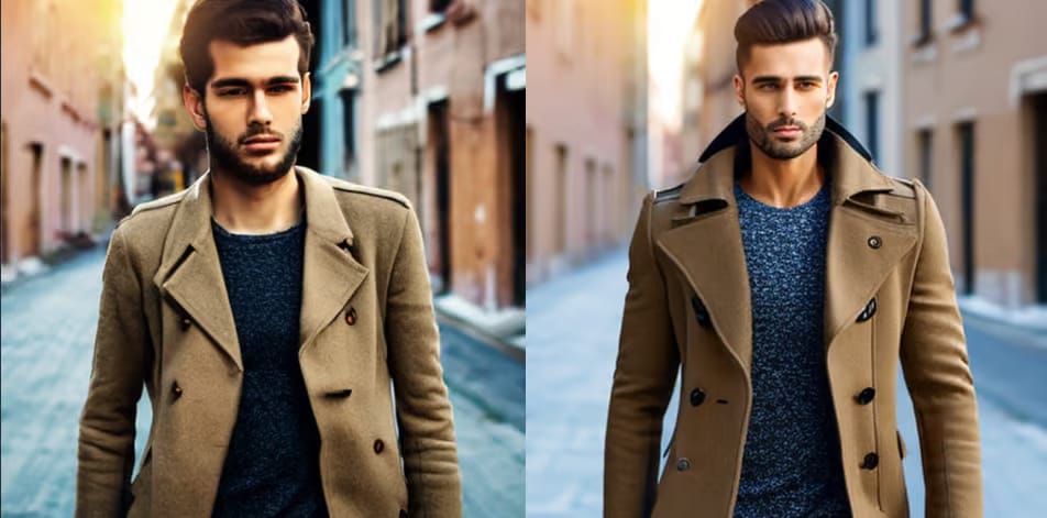 Example: "A stylish man wearing a beige coat, standing on a European street during sunset, photorealistic."