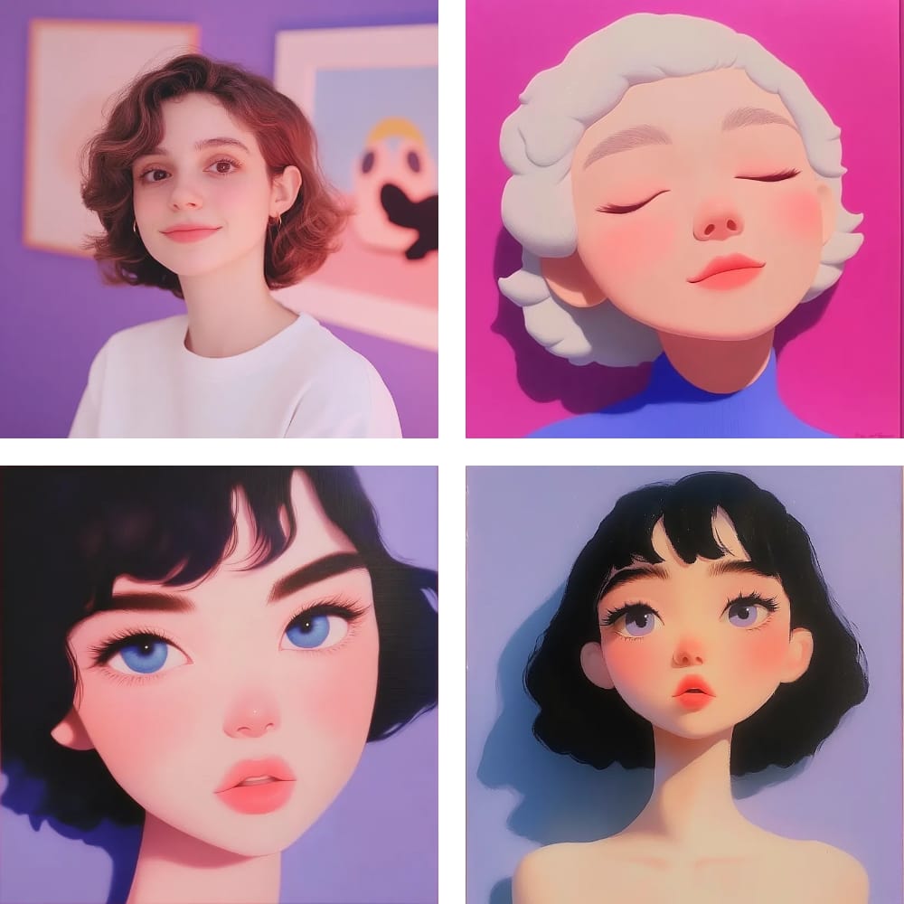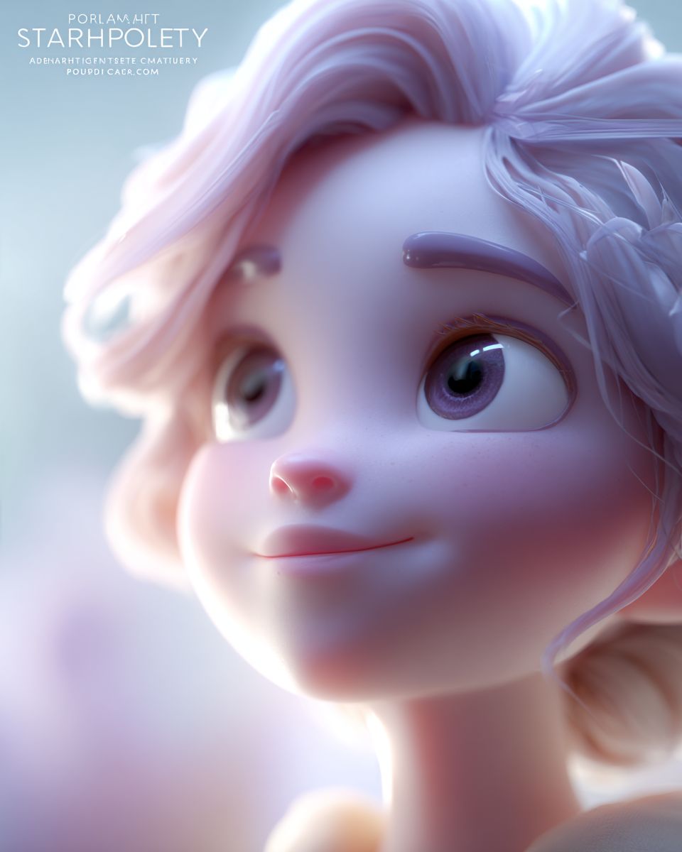 /imagine prompt: A 3D character portrait of the main character from the cozy game "Starlight Apothecary", in the gentle and dreamy "Pastel Mochi Pop" art style. The character is rendered with a super smooth, soft clay-like texture, with a subtle subsurface scattering effect giving her skin a soft glow. Her features are soft and rounded, with big curious eyes and a serene smile. The scene is lit with soft, diffuse lighting, creating a calm mood. The color palette is dominated by dreamy pastel lavender and blush pink. --ar 4:5 --style raw