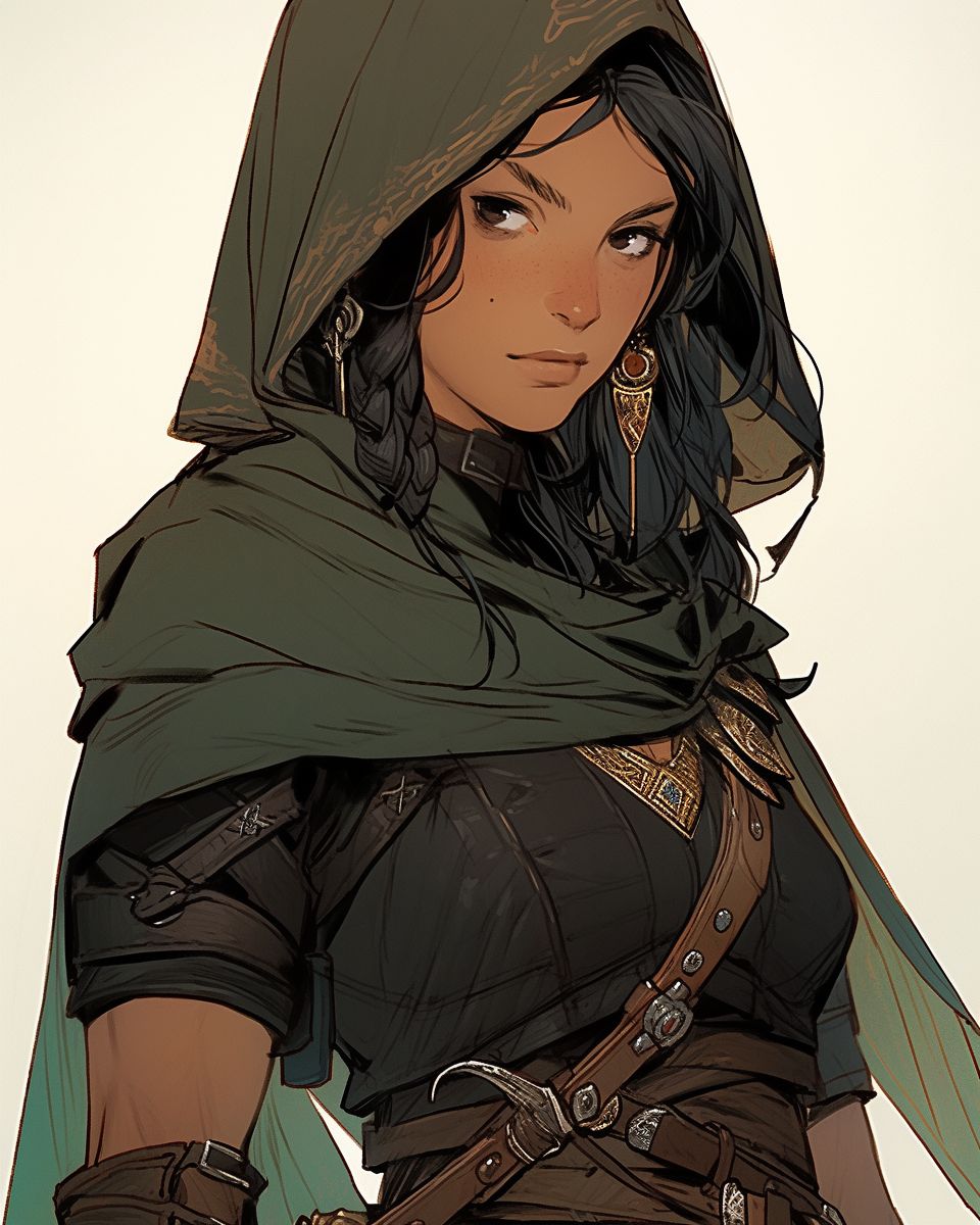 /imagine prompt: A character portrait of a female rogue from the fantasy RPG "Dragon Age: The Veilguard", in the beautiful Neo-Romantic comic art style. The artwork features clean and expressive ink linework, filled with soft, painterly digital coloring that gives her volume. She has a confident and adventurous expression. Set against a simple, parchment-textured background. --ar 4:5 --niji 5 --style expressive
