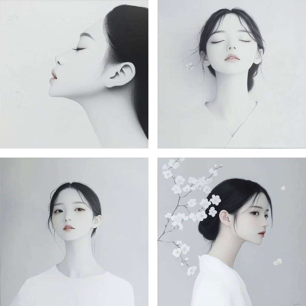 /imagine prompt: cinematic A beautiful, minimalist portrait of a serene young Korean woman, in the aesthetic of "Liu Bai Serenity". Inspired by traditional Korean ink wash painting. The composition is high-key and features a vast amount of negative space (Liu Bai) against a plain, off-white textured paper background. The color palette is almost monochromatic. Her skin is luminous and flawless. The lighting is extremely soft, diffuse, and ethereal.