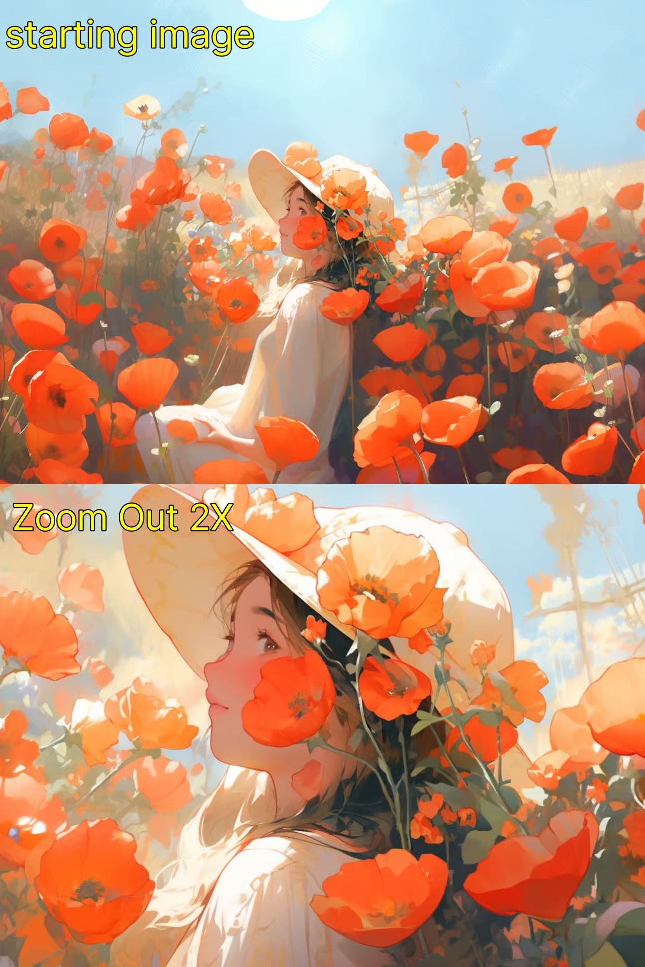 --zoom 2for doubling the size) and guide the new area with additional prompt details.Example: "Expand the scene to include a lush forest in the background --zoom 2."