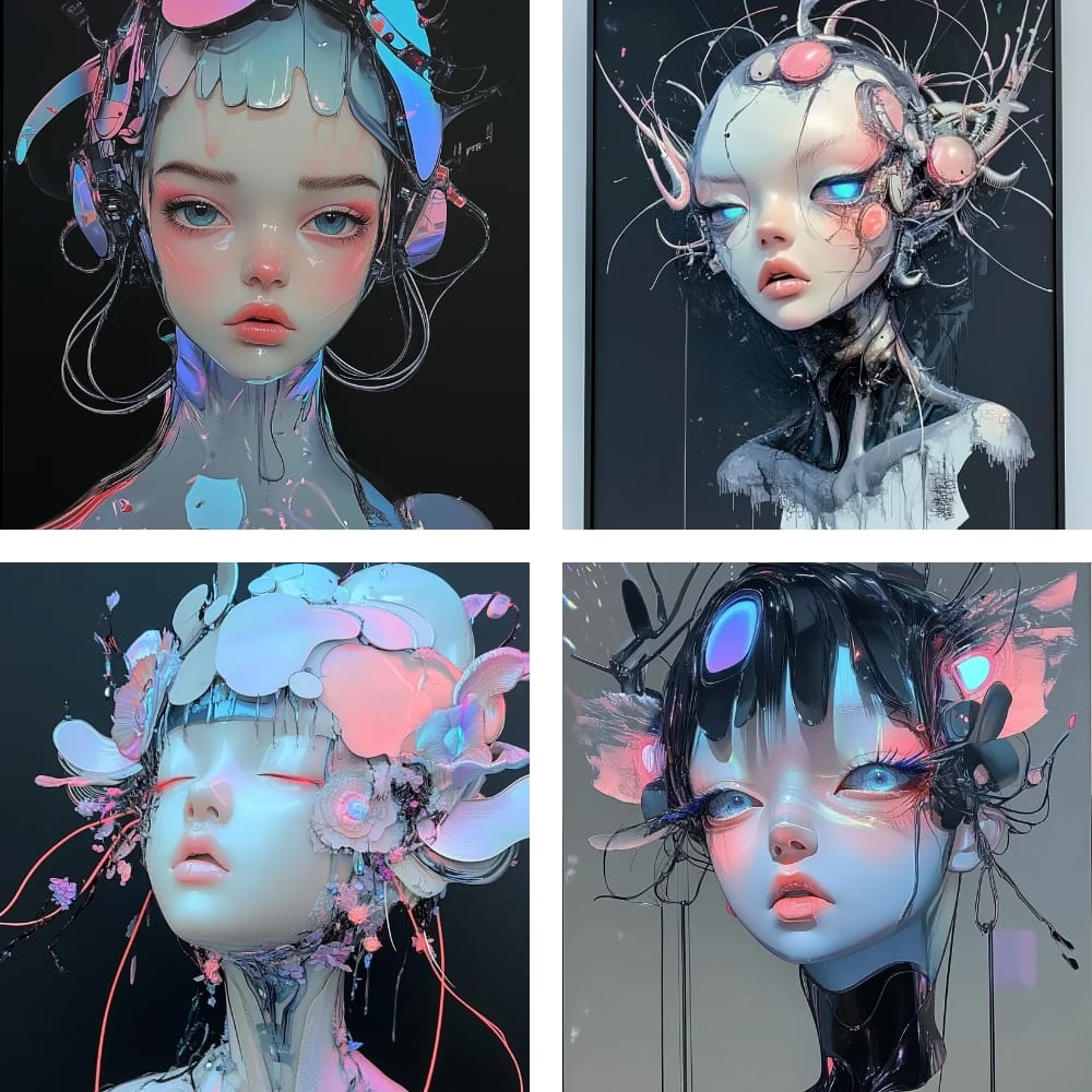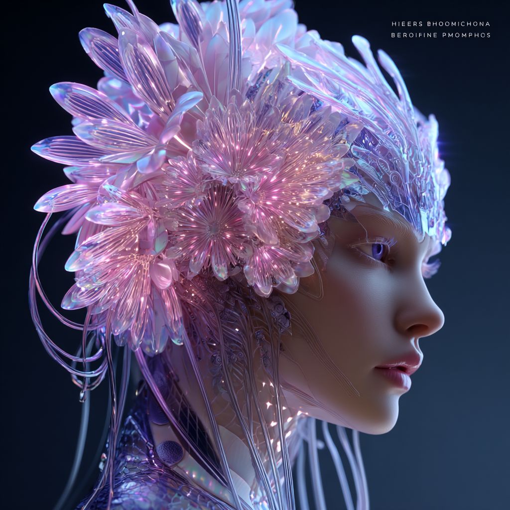 /imagine prompt: Hyper-detailed portrait of a beautiful biomechanical gynoid, in the stunning "Iridescent Biomorphism" aesthetic. Her head is adorned with an intricate headdress of glowing biomechanical petals and delicate holographic filaments. The cybernetic parts have an iridescent, mother-of-pearl finish, emitting a soft, ethereal glow of neon pink and electric blue that illuminates her flawless pale skin. Ethereal, melancholic, futuristic high fashion. Dark minimalist background